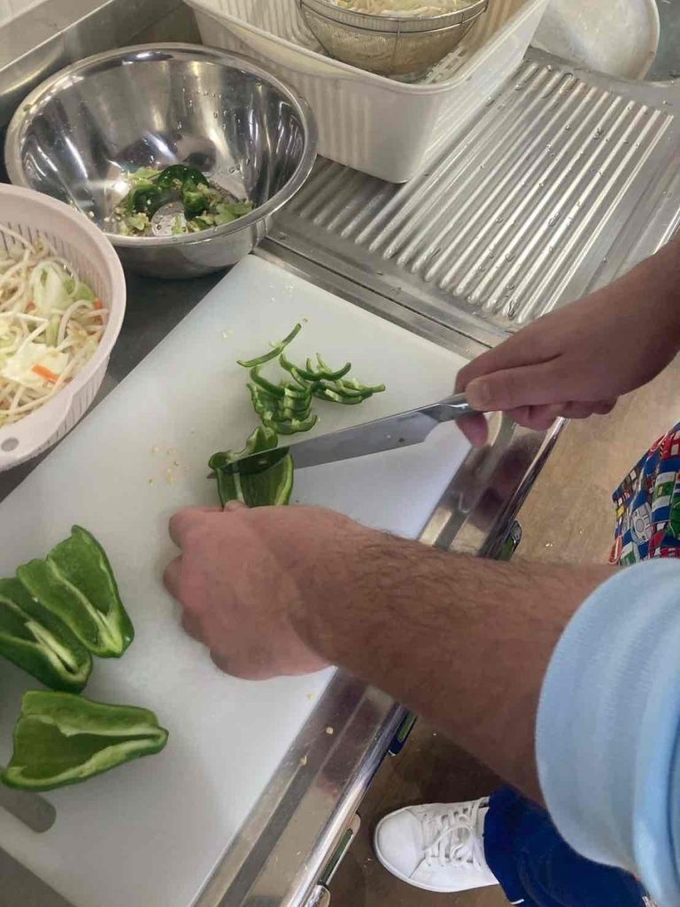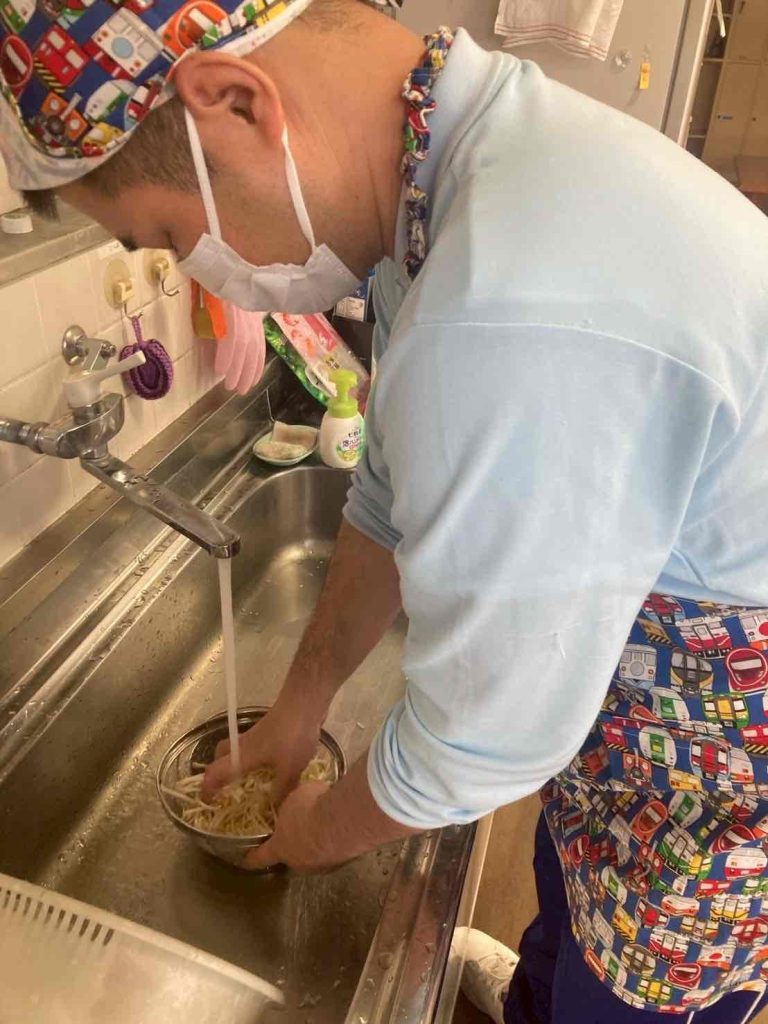焼きそばは野菜を洗い、切るところから始めました。でこぼこの形のピーマンも上手に細切りにしていました。豚バラ肉を切るときは、最初は切りにくそうにしていましたが、職員のアドバイスもあり、丁寧に切れるようになっていきました。最後に野菜と肉と麺を炒め、焼きそばソースの粉末を混ぜ合わせて完成!