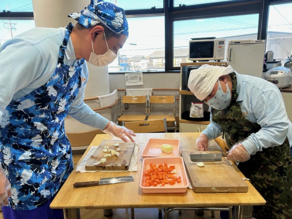 今回、調理実習の当番の方にはチャーハンに入れるためのニンジンや玉ねぎを細かく切る作業がありました。支援員からは「指を丸めて切ってね、指を切らないようにゆっくりね」という声かけもありましたが、当番の利用者さんは、上手に包丁を使って細かくしていました。