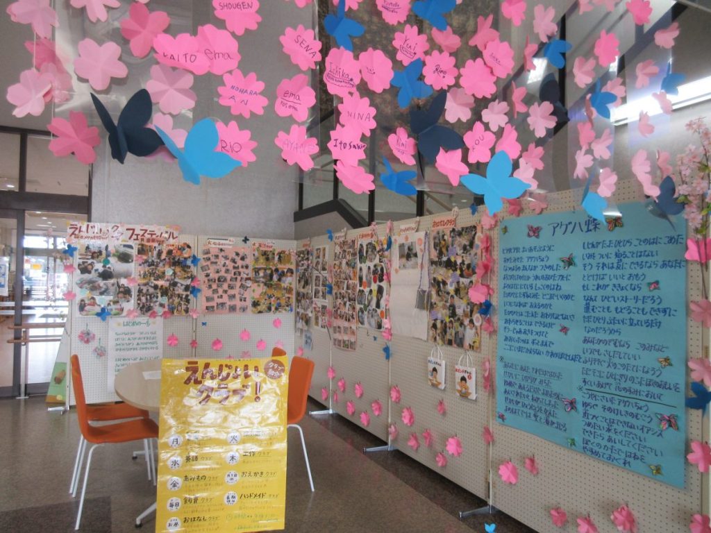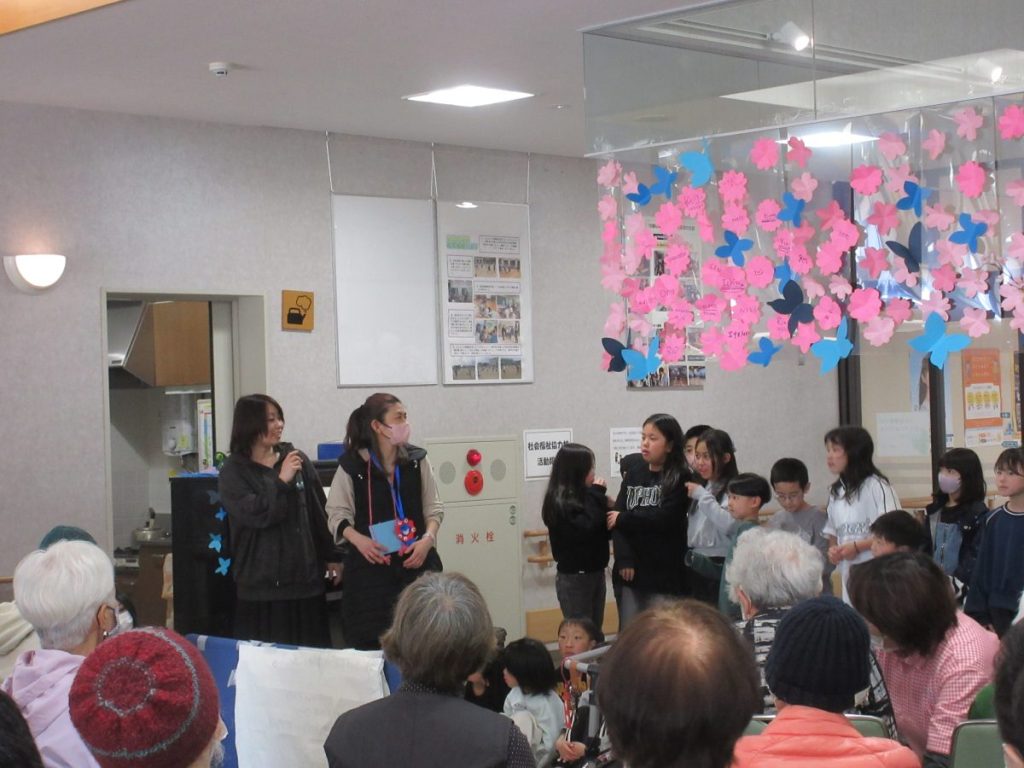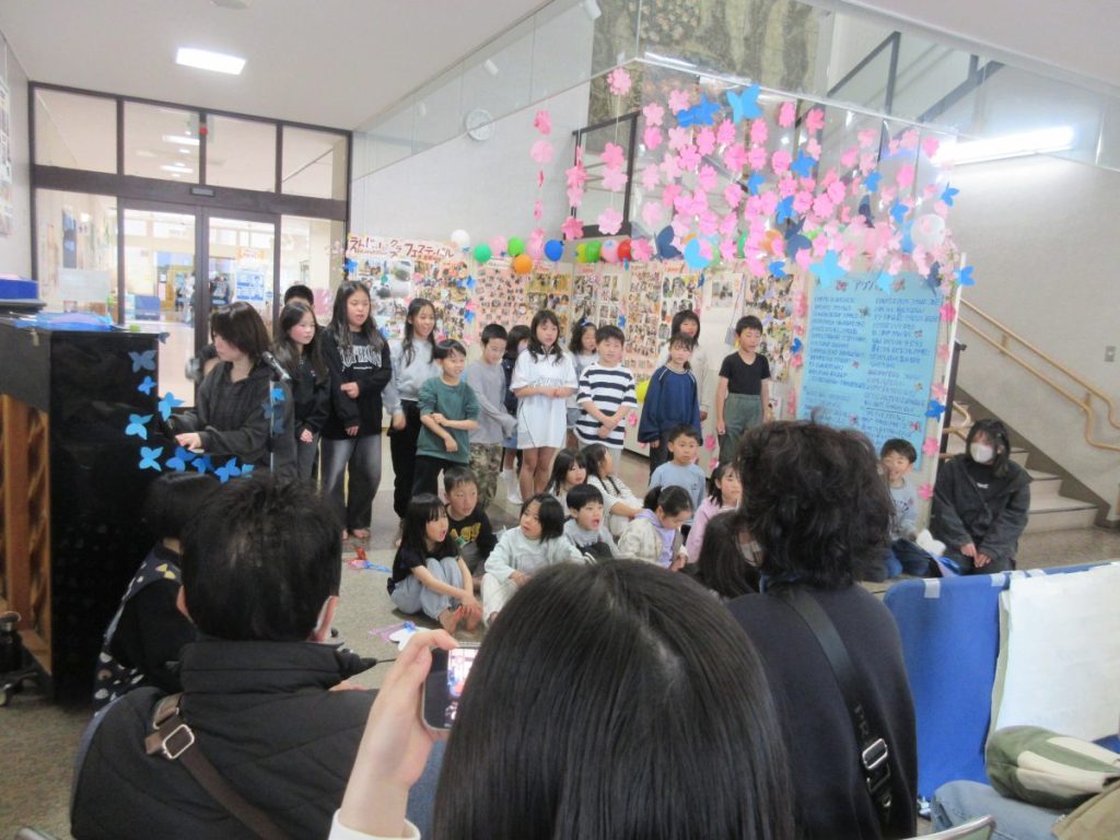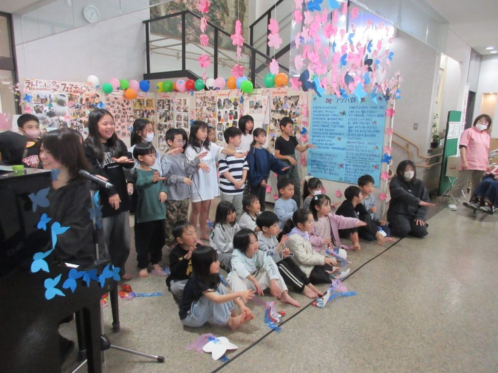 3月27日に、1階ホールで「えんじょいクラブフェスティバル」のミニコンサートを行いました。曲目は、「はじめの一歩」・「ABCのうた」・「アゲハ蝶」です。「はじめの一歩」では、子ども達が手話を行いながら歌いました。多くの保護者が見守る中、盛大な拍手と共にアンコールをいただきましたので、練習で行ったように、その場でダンスをしながら「アゲハ蝶」を楽しく歌いました。とても賑やかなコンサートとなりました。